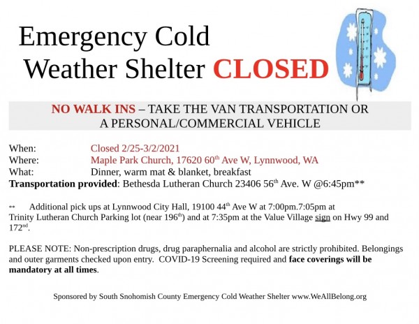 Emergency Cold Weather Shelter is Closed, 2/25-3/2/21